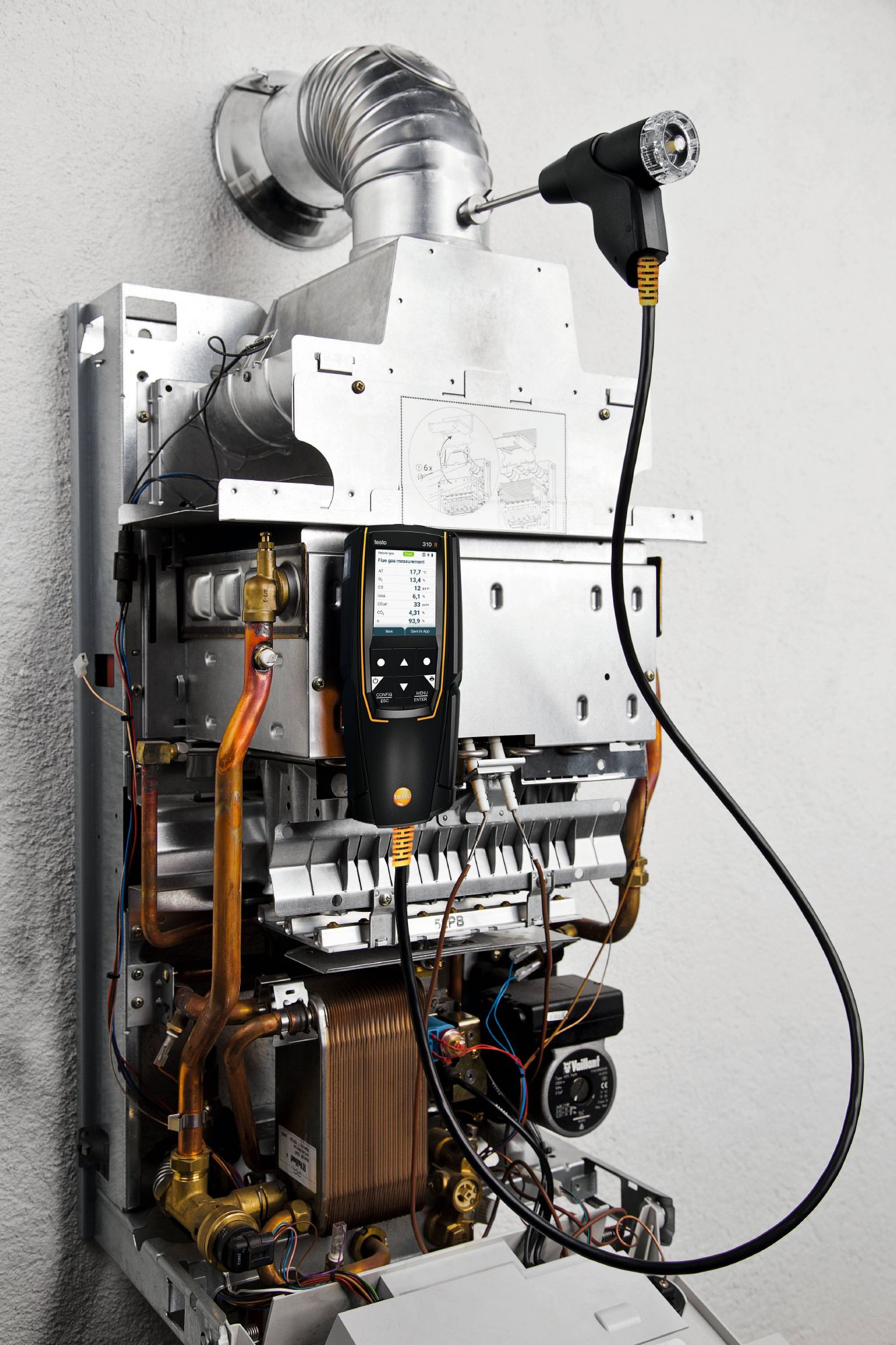- Simultaneous, individual measurement and display of all relevant measurement parameters by (O2, CO, CO2, flue gas and ambient temperature, CO environment, draught and pressure). Display configurable via the testo Smart App