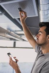 The testo 417 vane anemometer allows you to carry out quick and precise air flow measurements at air inlets and outlets.The easy-to-read display shows air flow speed and direction as well as volumetric flow rate and temperature.The anemometer can also calculate the mean time value, average value and minimum and maximum value at the touch of a key