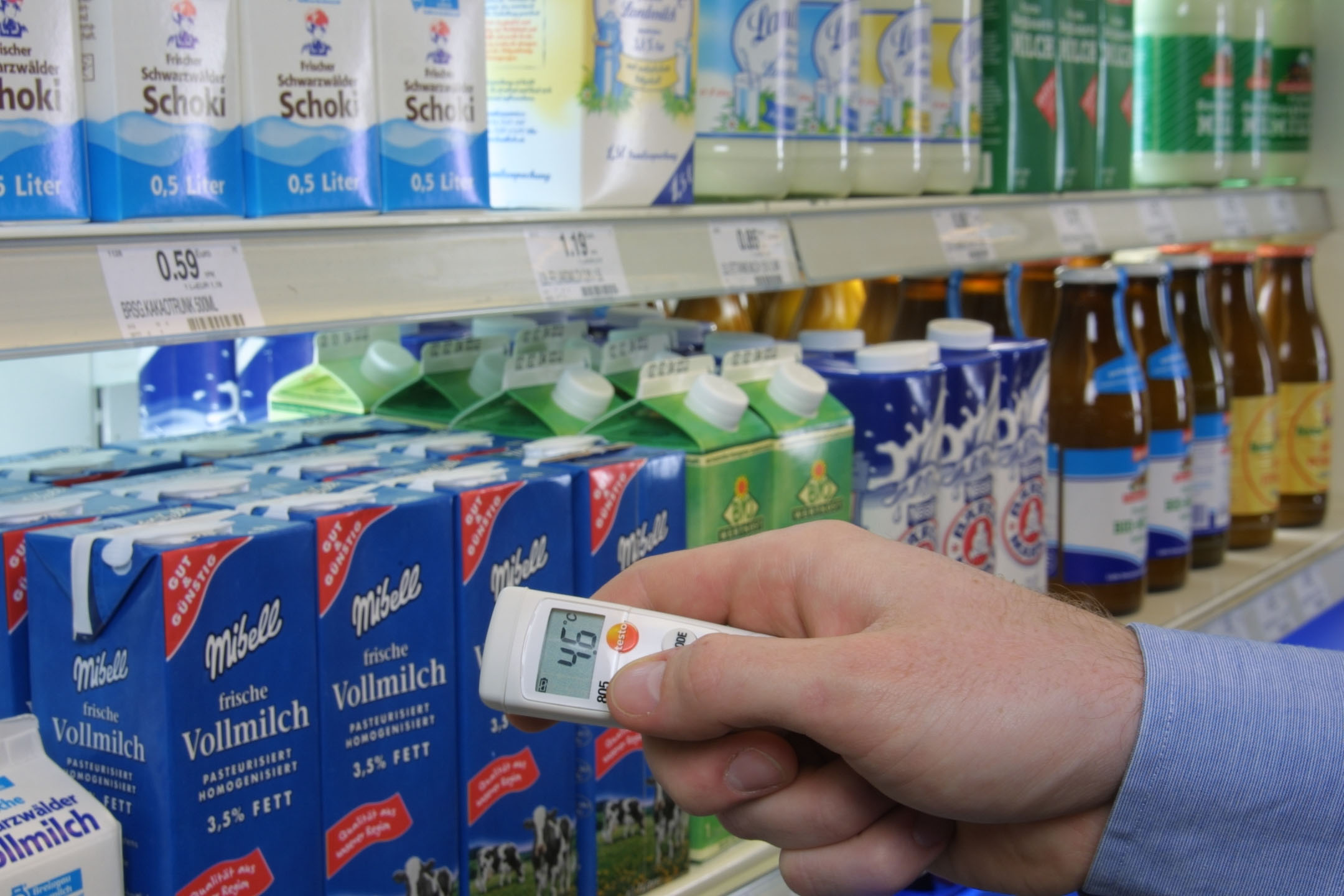 Testo 805 the mini infrared thermometer from Testo, ideal for food sector for non-contact measurement of surface temperatures. Whether checking incoming goods, or a refrigerated cabinet in a supermarket: the temperature of your products can be recorded at the touch of a button.
